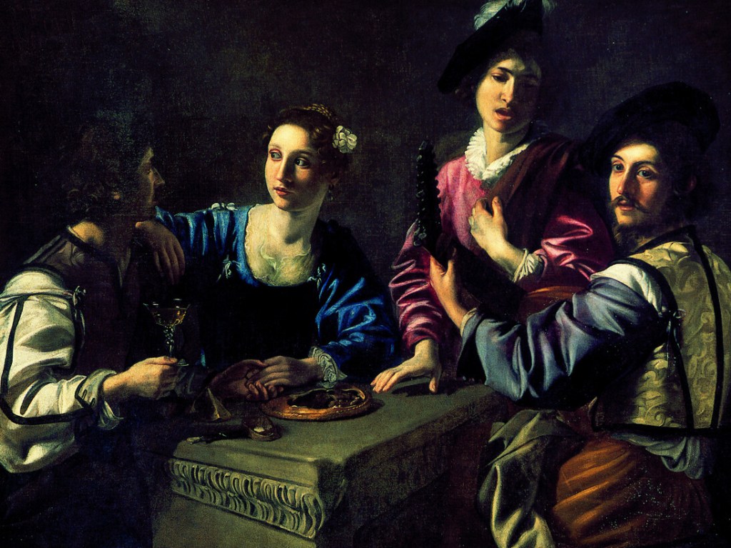 Le concert au bas-relief de Valentin de Boulogne, (1591-1632) grand caravagesque français qui fait l’essentiel de sa carrière à Rome où il arrive aux alentours de 1614. Alors que le Grand Tour bat son plein et que les touristes viennent voir la merveille moderne de l’art et de l’architecture baroque qu’est Rome, les peintres caravagesques décident de représenter des scènes rapprochées, dépourvues de décor et dont la plupart prennent vie dans la taverne, lieu quotidien des petites gens empreint aux excès et aux vices en tous genre.