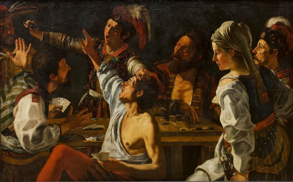 Dans La rixe, Theodore Rombouts donne à voir tant les excès moraux (tels la colère et la tricherie) que physiques (violence). Il représente sur cette toile une scène de bagarre entre deux joueurs où un homme muni d’une paire de ciseaux est prêt à attaquer sa victime ayant probablement triché. L’expression de la débauche est réalisée avec une précision minutieuse, car la victime apparaît partiellement dénudée. En faisant de la colère incontrôlée le sujet principal du tableau, le peintre flamand s’inspire d’une tradition néerlandaise consistant à représenter une version moralisatrice des sept péchés capitaux dont la colère fait partie.