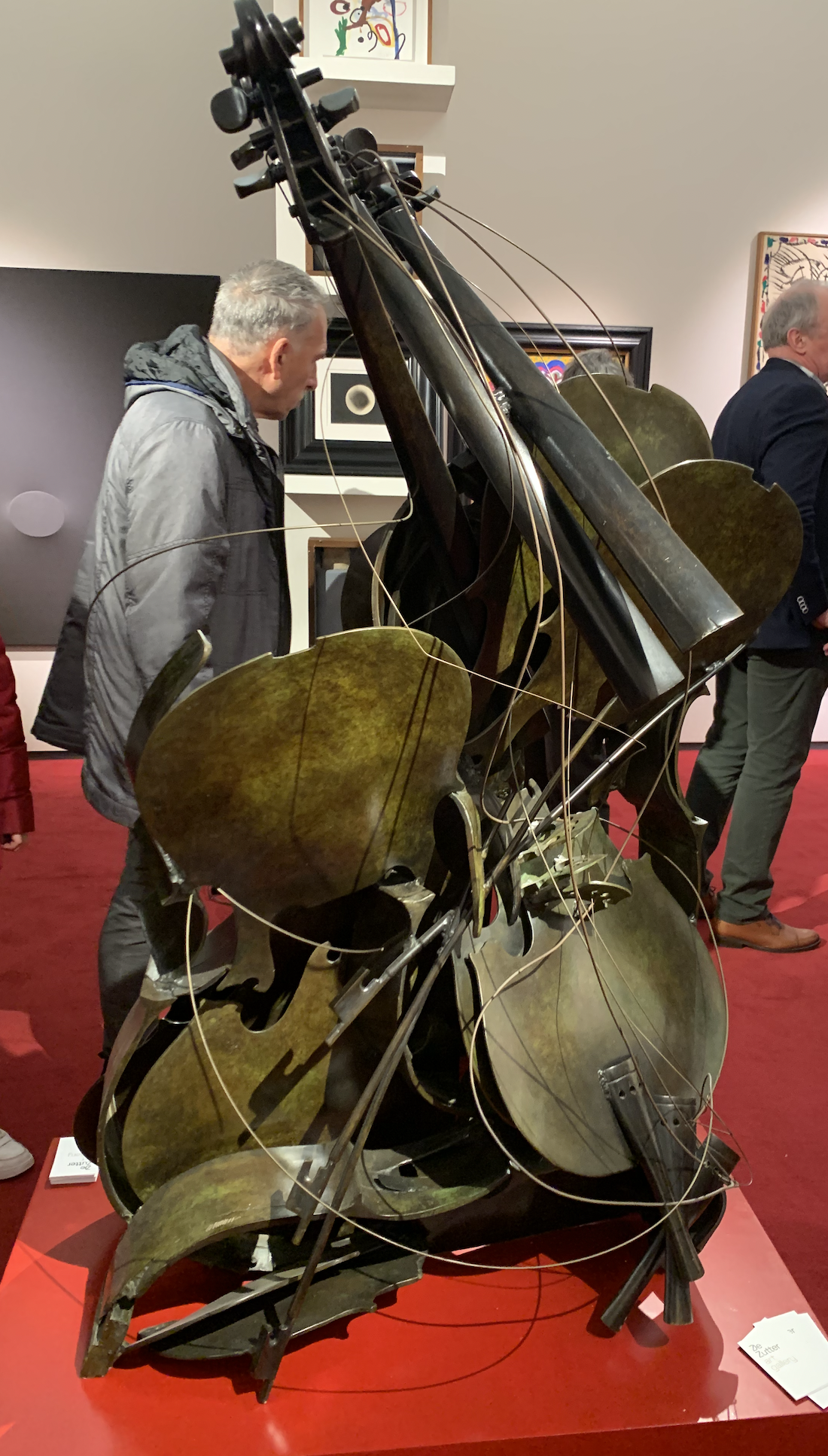 De Zutter Art Gallery (Knokke-Heist) displayed three paintings by Basquiat at its front, with the quote “I’m not a real person, I’m a legend” written above. A bit further inside the stand, a sculpture of deconstructed violins introduced a dynamic and fragmented dimension to the space.