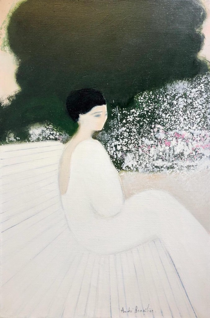 André Brasilier, Femme assise (Le banc blanc), 1980, Oil on canvas. 81 x 54 cm (31.9 x 21.3 in)