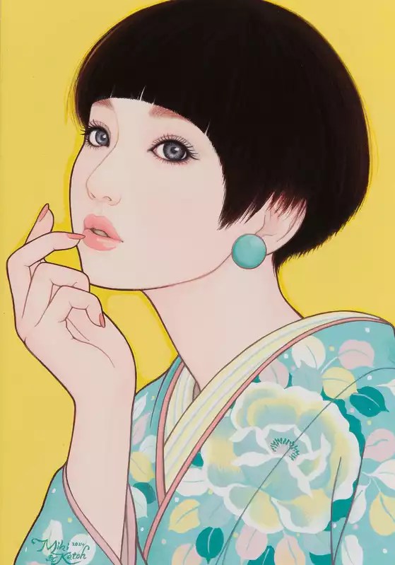 Her tightly framed portraits recall the bijin-ga: the “pictures of beautiful women” that flourished in the Edo period, but Katoh overturns their conventions. Where those historical prints idealized passive, ornamental women under the gaze of male artists, her figures look confident and self-possessed. Their kimonos and their different patterns become emblems of self-expression and freedom, what she calls “the spirit of independent women.”