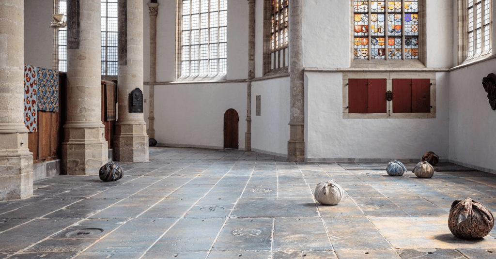 Depending on the weather and hour, some bundles bask in glorious rainbow light coming through the stained glass, while others remain untouched by any rays of warmth. Kim’s “bottari” work was first introduced in 1992, but the origin of the “bottari” is far older than 30 years. Arranged on the cold centuries-old gravestone floor of the church, the “bottari”, which symbolise people in transit, resonate with Amsterdam’s identity as a city of arrival and departure.Presented during Amsterdam’s 750th anniversary, the installation reflects deeply on the city’s long and complex migration history, in a time in which in Europe and the Netherlands, national governments are enacting increasingly hostile policies towards individuals forced to leave their country of origin.