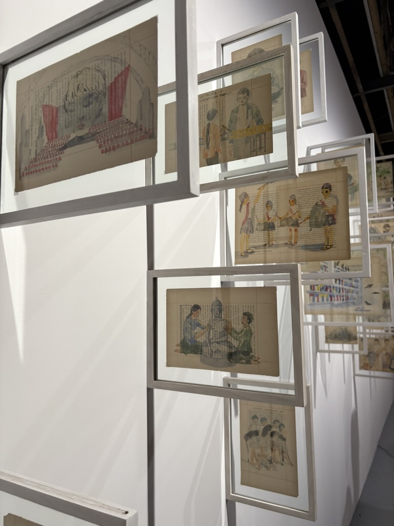 Nearly 100 pages, on which she painted different scenes, are each individually framed and nailed perpendicular to the wall. Some are playful: children climbing water towers or bands of drummers marching in line. But elsewhere, Phan’s fantasy takes on a more sinister tone: as children appear harmed (disembodied); under duress (wearing blindfold), in a process of metamorphosis (the sexual organs of these children becoming tropical plants – such as papaya, sugarcane and dragonfruit) or undertaking an absurd task (such as attempting to use chopsticks without their hands as they kneel on the ground).